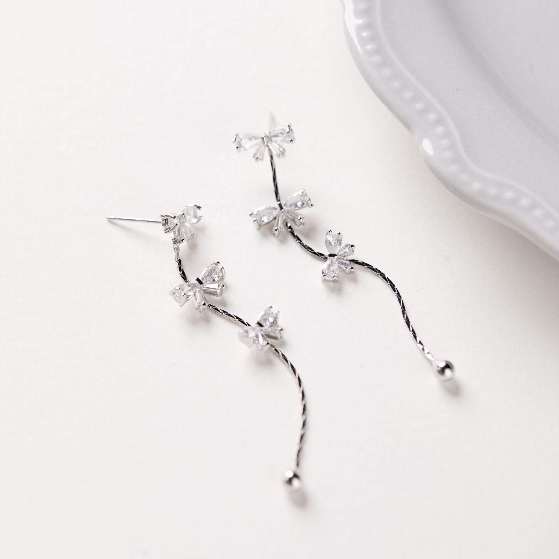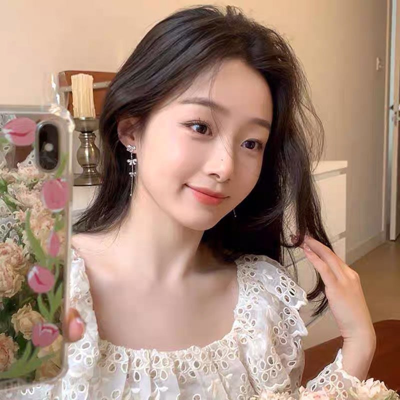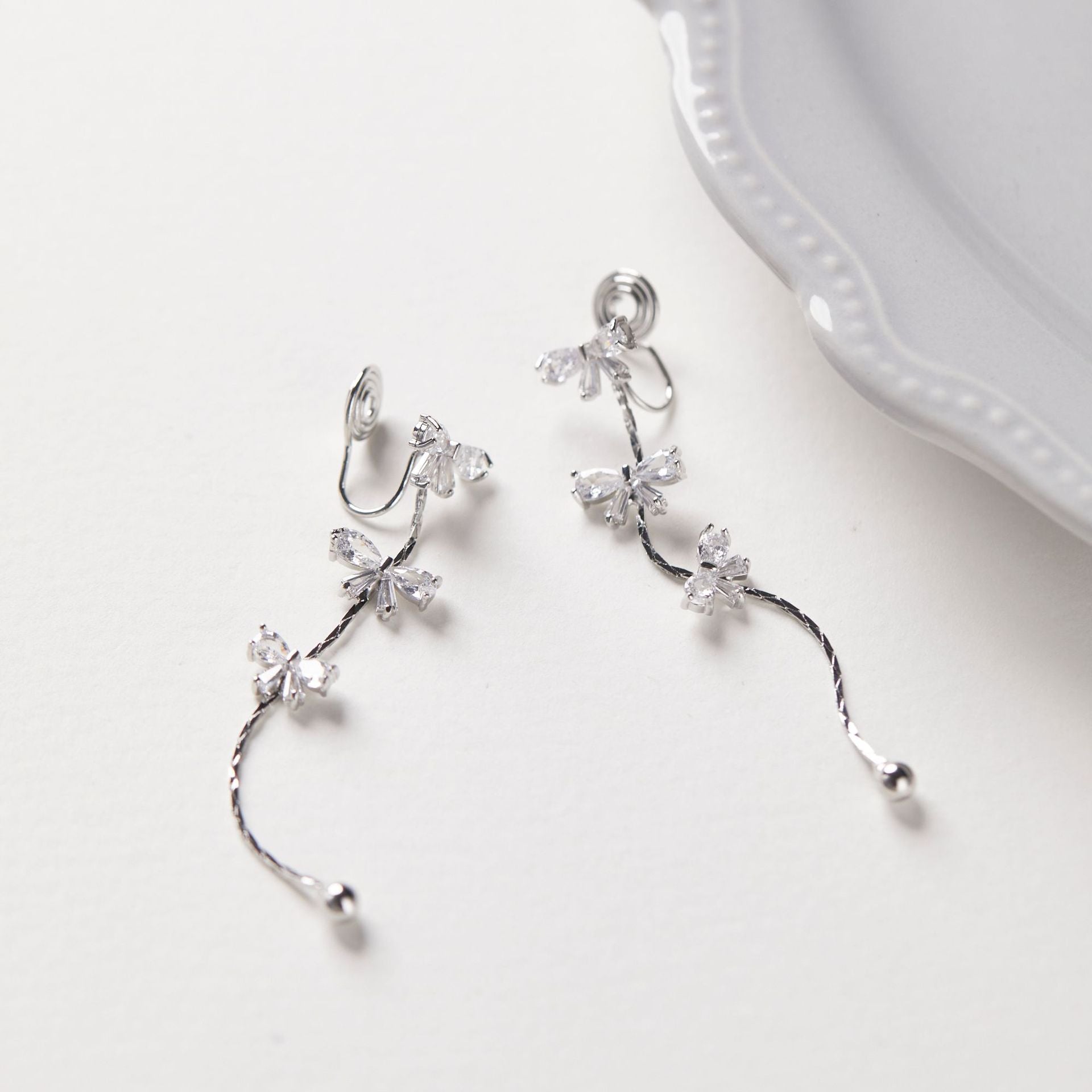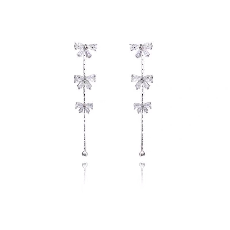 Bow Fringed Zircon Long Ear Clip Earrings