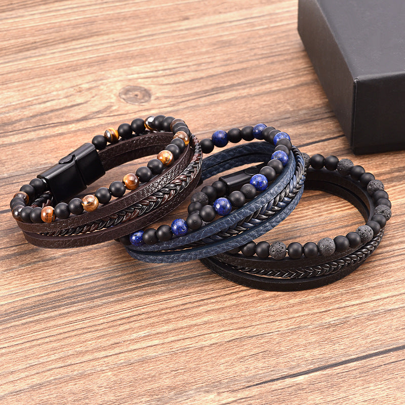 Men's Leather Woven Tigereye Magnet Beaded Titanium Bracelets