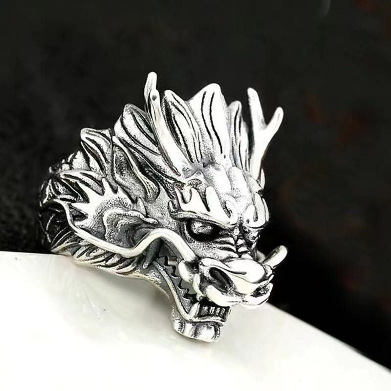 Men's Sier Blue Dragon Faucet Power Style Personalized Chinese Rings