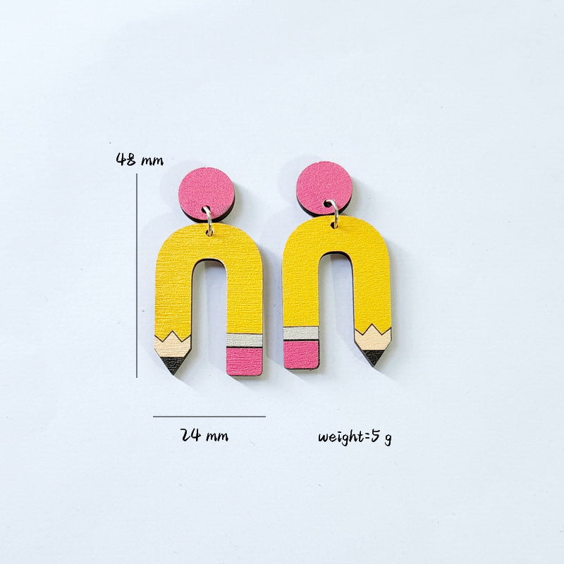 School Wooden Pencil Rainbow Ruler Love Earrings