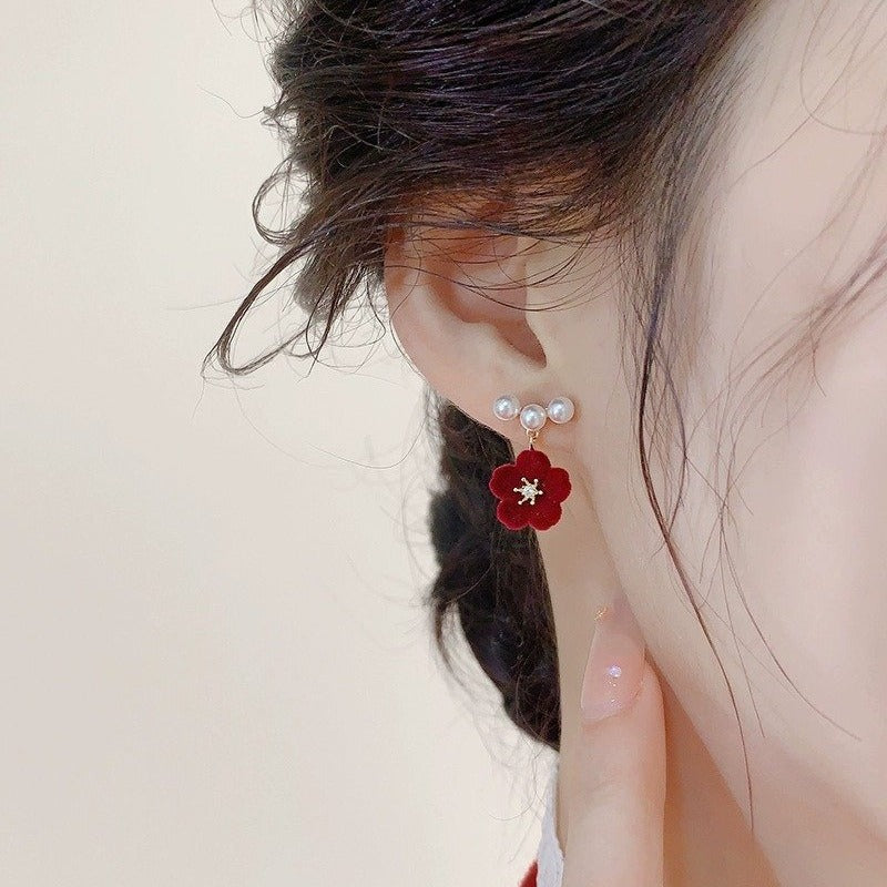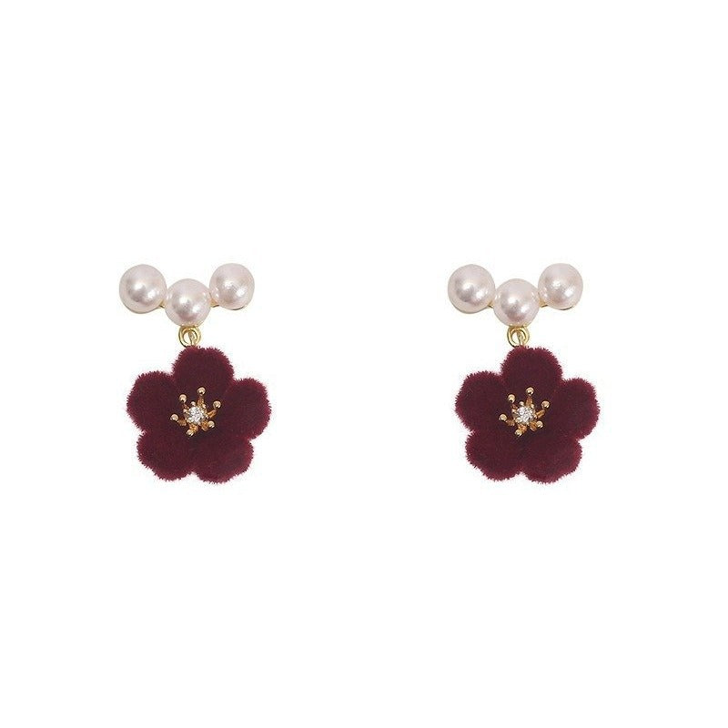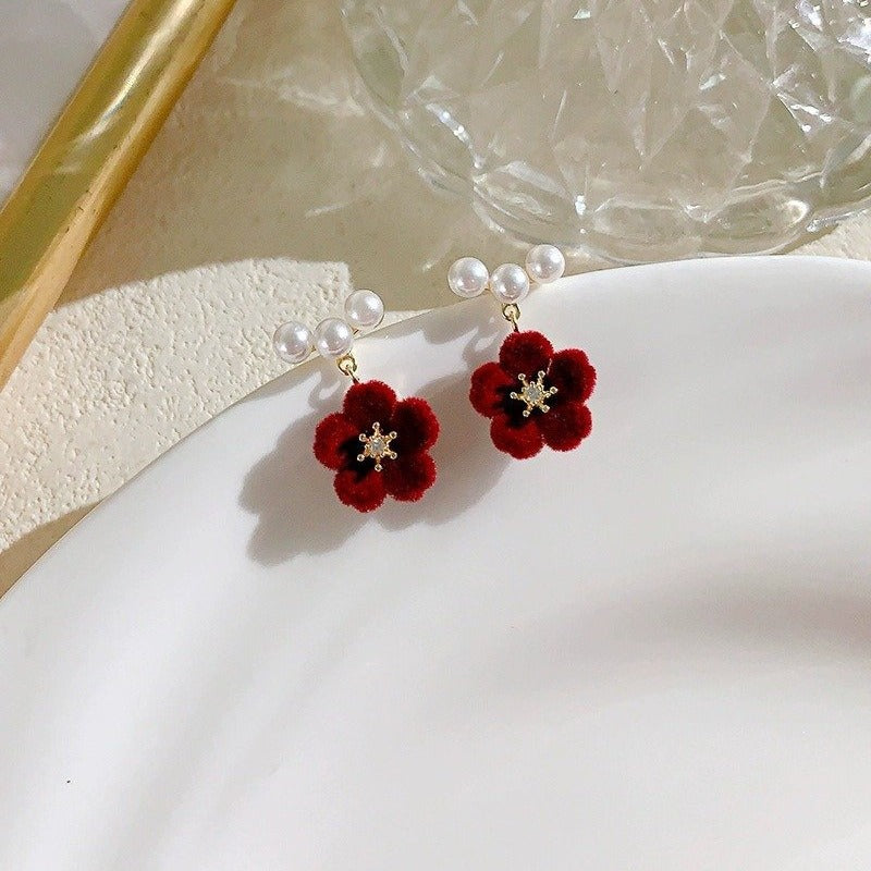 Women's Red Veet Flower Small Pearl Ear Earrings